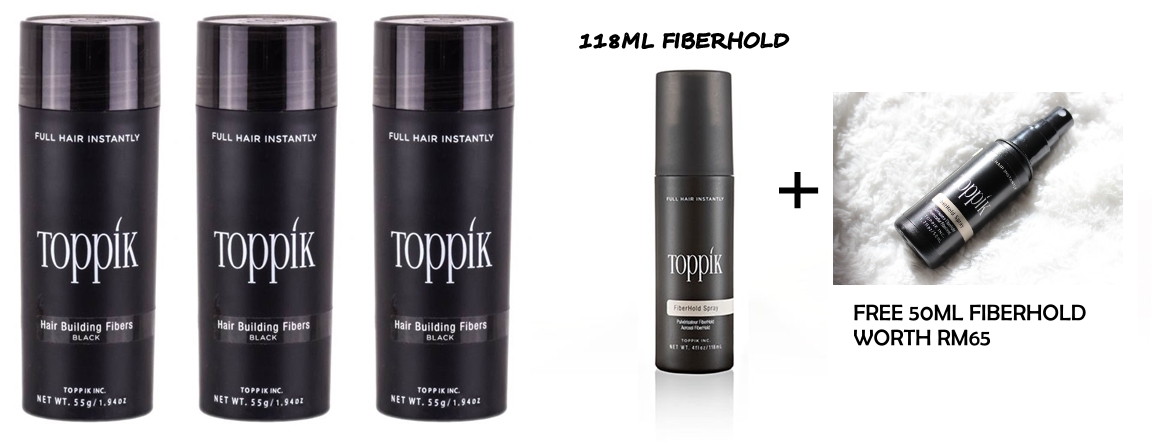 – 3 x TOPPIK 55G GIANT SIZE HAIR FIBER + 1 TOPPIK 118ML FIBERHOLD SPRAY + FREE 1 X TOPPIK 50ML FIBERHOLD